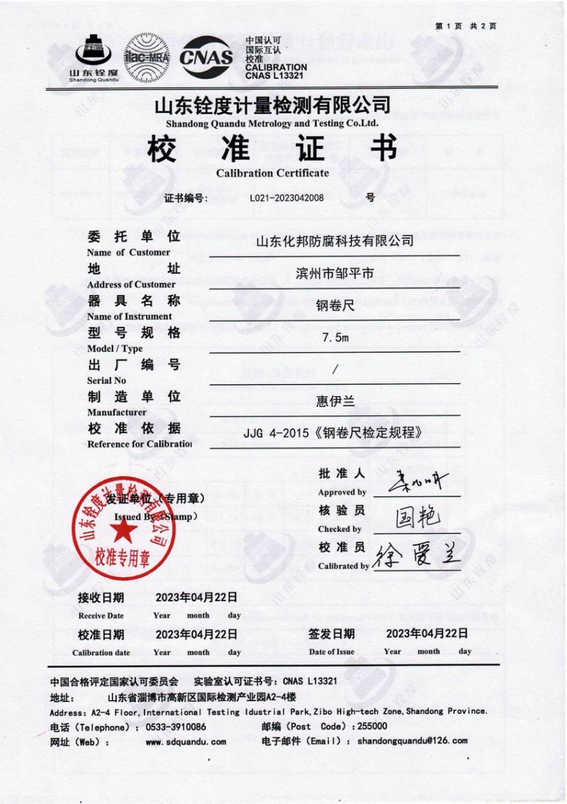 檢測儀器報告證書:鋼卷尺長度堅定報告